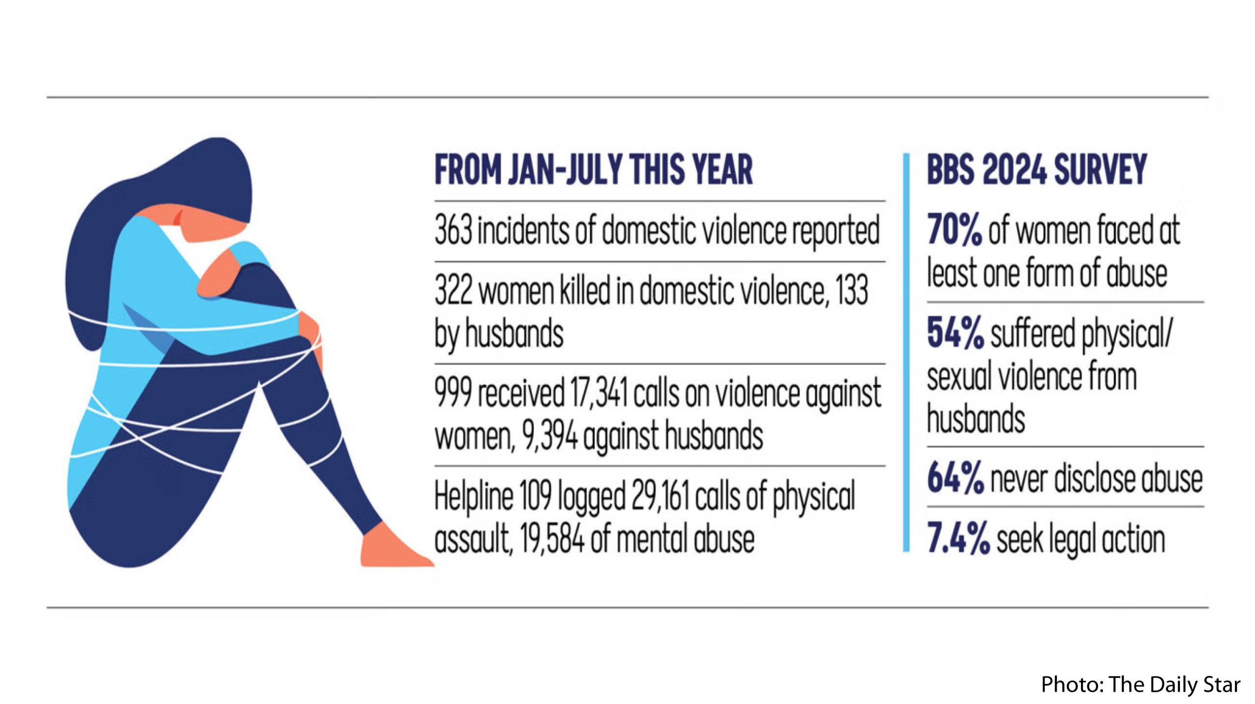 The latest Bangladesh Bureau of Statistics (BBS) Violence Against Women Survey 2024, based on interviews with 27,476 women, paints an equally alarming picture. Women are three times more likely to face physical abuse and 14 times more likely to suffer sexual violence from their husbands than from others. Of the surveyed women, 70 percent reported experiencing at least one form of abuse — physical, sexual, emotional, economic, or controlling behaviour. More than half (54 percent) said they had faced physical or sexual violence from their husbands. Yet most victims remain silent — 64 percent never disclose the abuse, and only 7.4 percent seek legal action.